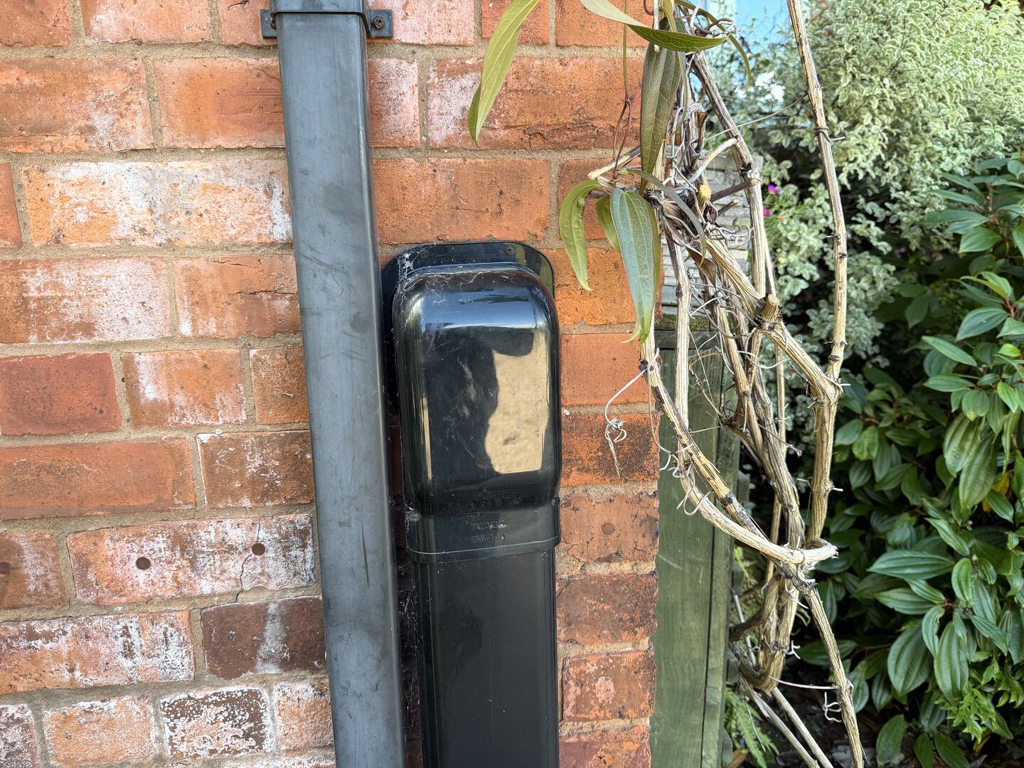 Here’s the trunking that hides our wiring, heat pump flow & return pipes. What do you reckon is waiting under the cover?