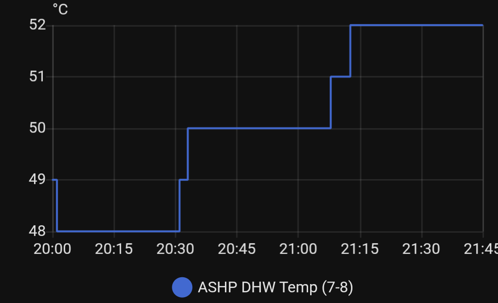 I have a Grant Aerona3 13kW and I've wired it so the ASHP controls the legionella cycle (disconnecting the spurious Grant timer box they install). The way this works is the ASHP runs up the hot water to the maximum temperature it can manage, then hands over to the immersion heater for the last few degrees to get it to 60C. On the standard setup it has 2 hours to do that - there's a service manual parameter to extend it to 3 hours, which I've done. After 3 hours the water is only at 50C and the ASHP flashes 'LC' meaning legionella cycle failed. Next week comes around and it does legionella again and the same happens... every week.