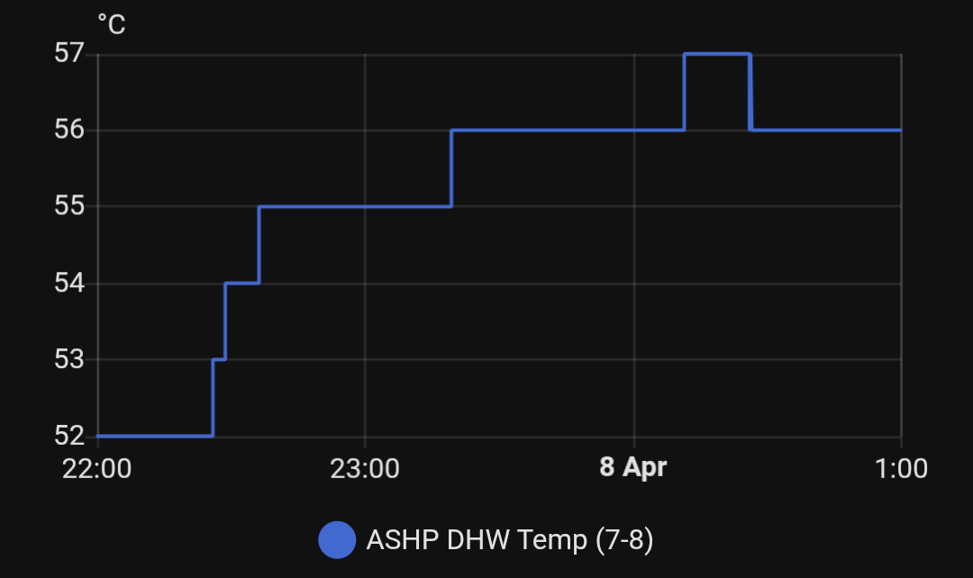 I think we're talking at cross purposes here. The above test is with the ASHP completely turned off. The setup is mains -> power meter -> contactor -> immersion, and the contactor is turned on. ie the immersion is just constantly across the mains and yet it can only achieve 57C at its maximum setting. There is no thermostat in circuit beyond the thermostat integrated into the immersion.
