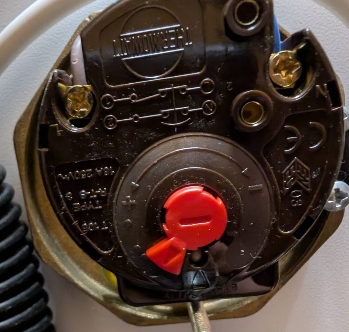 It seems the hot water temperature is plateauing at 52C. I confirmed this with two thermometers in the drawn water. I could also see that the current had dropped away, ie the immersion had cut out even though the contactor was still enabled. I took off the back of the immersion (Thermowatt 340160900000 aka 3401609) and I saw this: