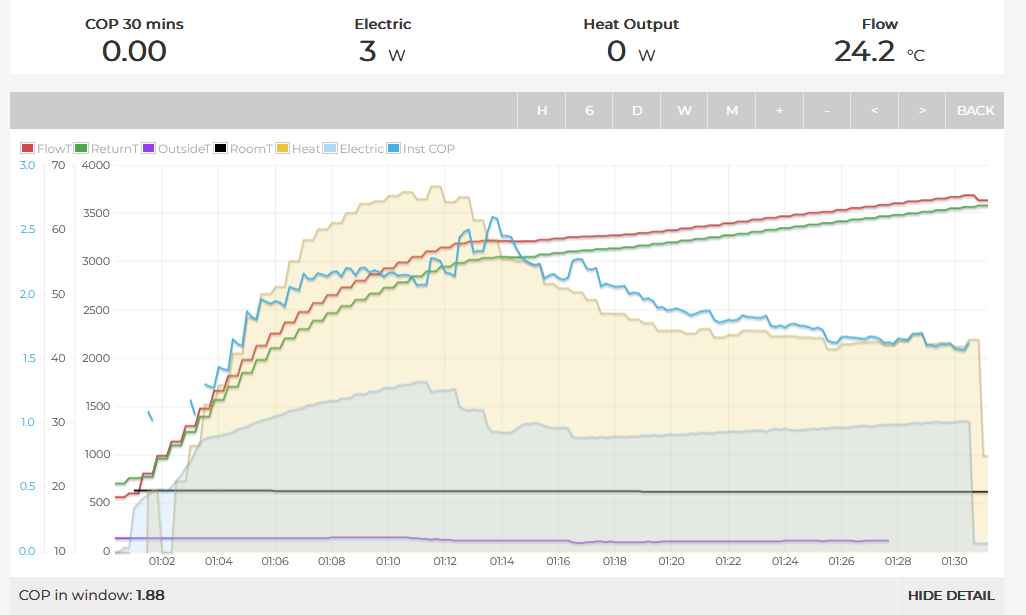 The COP over this time is about 1.9 which nearly doubles the efficiency compared to the immersion. (So costs about 3.5p per unit compared to 7p overnight). I think that the 30 min slot provides about half of my daily DHW needs.