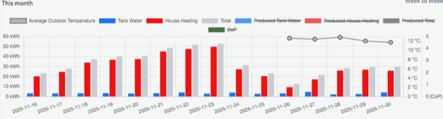 Btw, as you can see in the above explanation, it's not that the heat pump just sits idle. It runs at 45-55C flow temperatures with a deltaT of 7C, while the outdoor temperature is around 10C. So it's definitely putting in a good amount of heat.