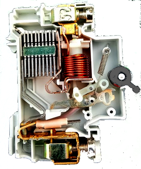 When the contacts open, the magnets pull the resulting DC arc into a series of metal plates called the arc-ladder where it gets quenched.