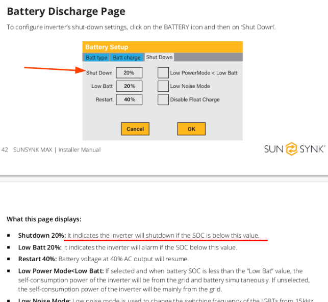 @ggw I'm reading the Sunsynk ECCO manual and I've found some relevant information about low-battery settings: