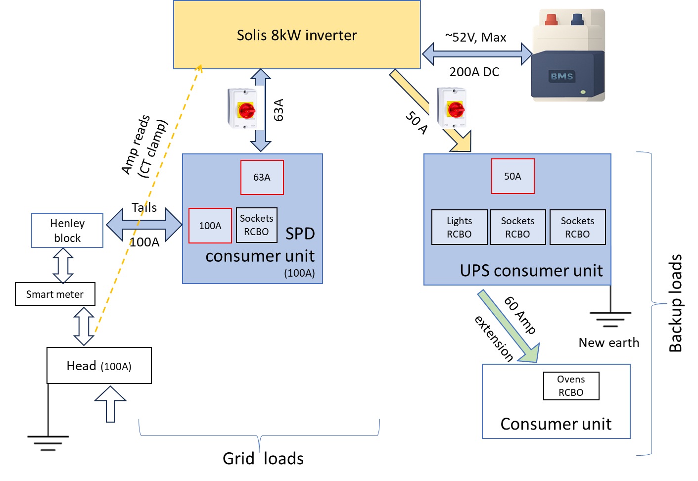 I think the assumption is that the inverter would be able to continue supplying power to the old consumer unit. In order to have a fully automatic system, the Solis will only provide backup/UPS power to the backup unit. It will not supply the grid unless the grid is live.
