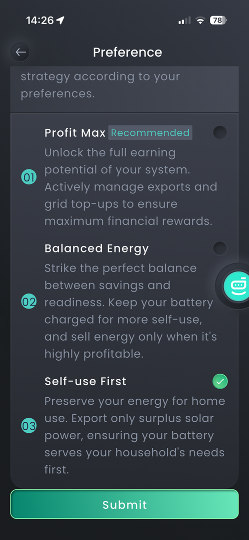 @editor apparently it helps optimise charging and discharging, max profit is popular but it does work the batteries hard. We will prob go back on self consumption when we are back on line