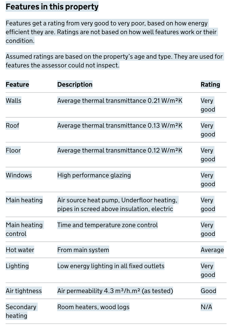 For example the description of the heat pump says a lot more - ASHP, Underfloor heating, pipes in screed above insulation, electric. That is exactly the same as my installation except the EPC omits the additional wording about the pipes. My friend clearly also had the actual thermal performance of the walls and the overall air tightness tested.