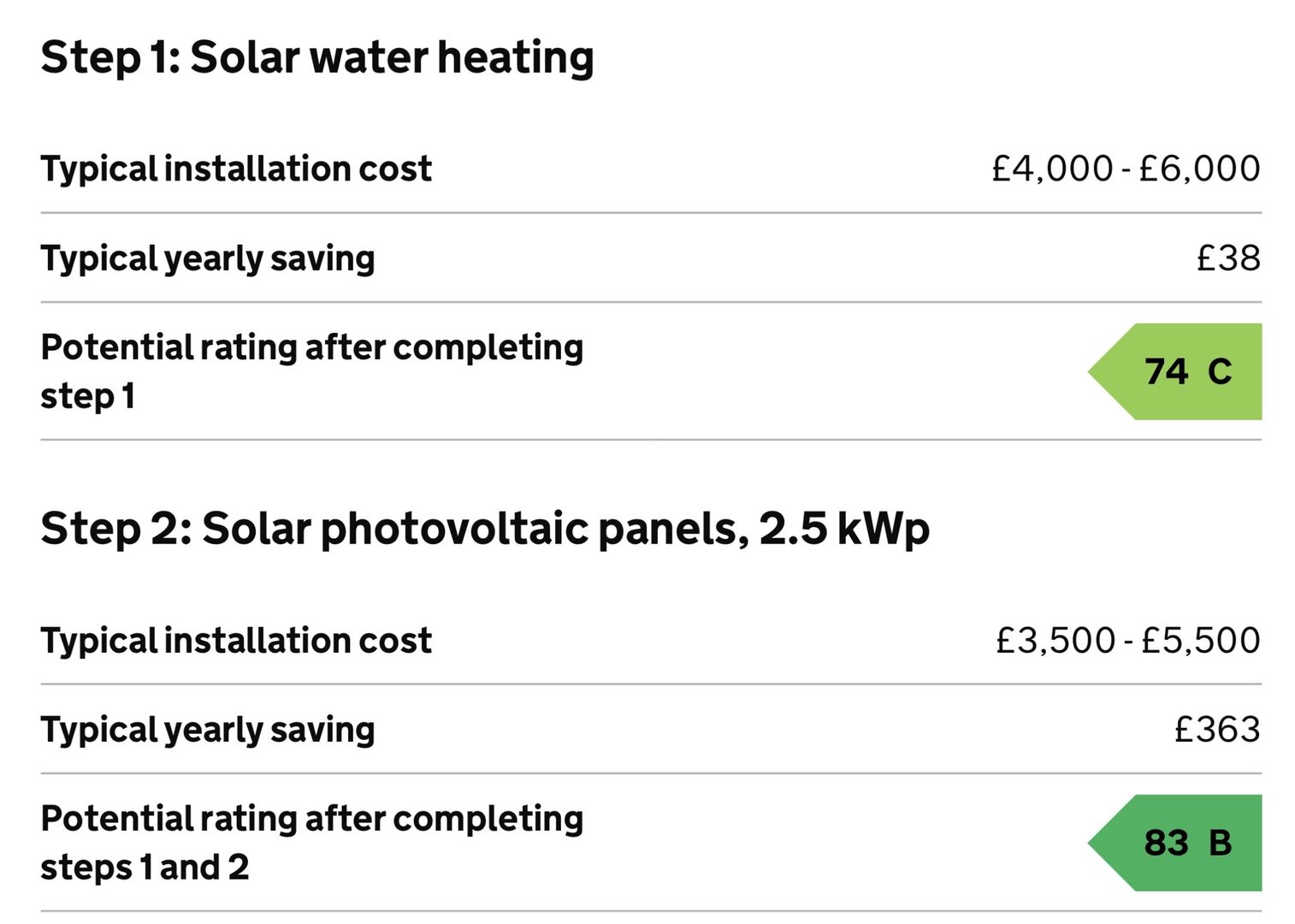 The guidance I was given suggested a regime that I consider fitting solar heated DHW and some solar panels; I have more than ‘leveraged’ my setup as I have added far more (8.1 kWp. of solar panels plus battery storage too as well as a Sunamp Thermino for the DHW) Then there is the heat pump - oh wait a minute … that probably means I have knocked the figure back and my ‘C’ has become a ‘D’ rather than a ‘B’!😉 Regards, Toodles. (Extract of improvement advice attached)