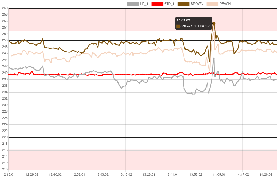 Here's an area-wide voltage-rise which took my Brown Monitor outside the upper limit. Peach and Grey Monitors were similarly affected, but didn't exceed 253v because there was less solar-generation in their locations at that time.