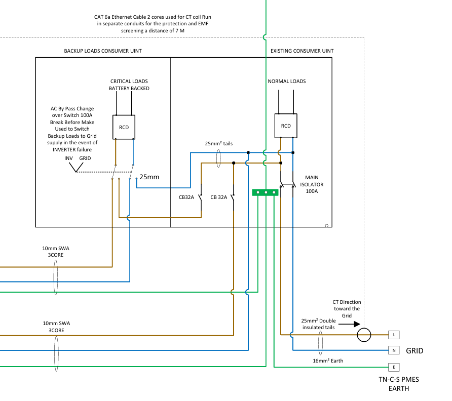 - the grid rcd/rcbo needing to be one specifically spec'ed for bi-directional use (mcbs are bi-directional). For background, see "isolating the system for a planned power cut"