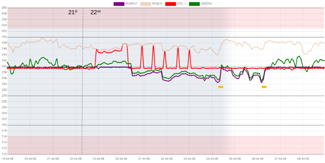 Here a timeline showing two grid-monitors (green and purple) measuring grid voltage as the charge current is slowly reduced over 3 or 4 minutes.