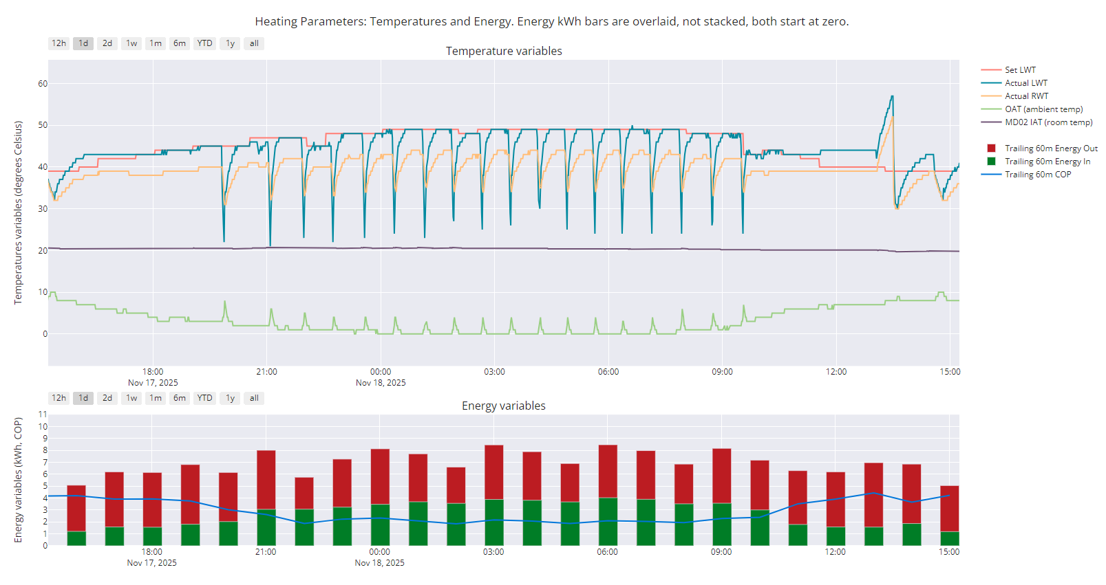 A different heat pump (Midea 14kW) but a stark reminder of what a difference a change in OAT makes to the trailing 60 minute COP (blue line in lower chart). Last night was the first real frost this year (south UK), and all the cycles in the middle of the upper chart are defrost cycles (LWT falls below RWT).