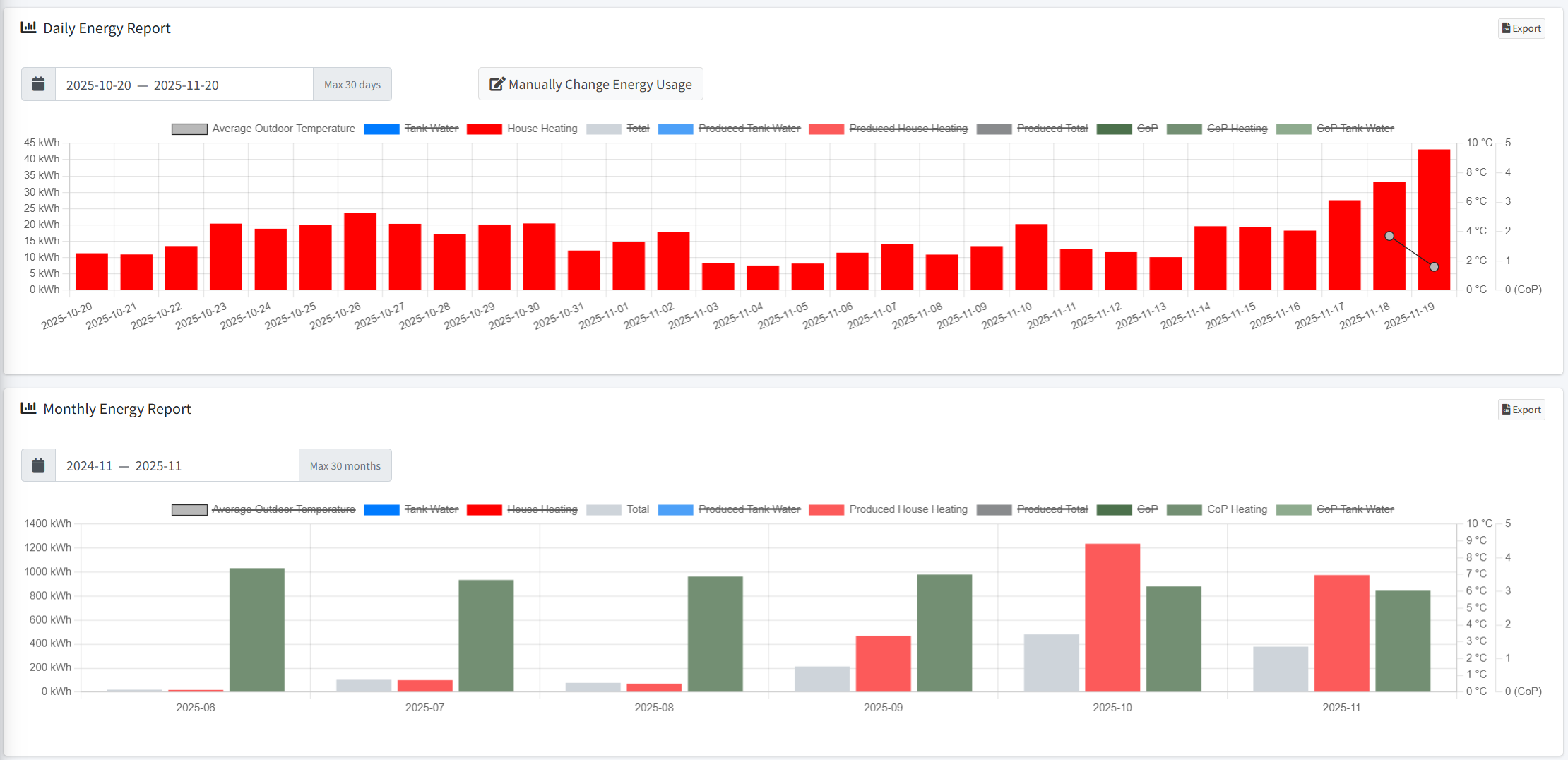 January 2025 energy consumption was 1022kWh for the whole month, so average 35kWh/day. Of the month total 988kWh was heating, the balance DHW (we dont use much hot water). The max daily consumption in Jan was 50kWh. Feb total was 822kWh, March total 608kWh, in each case about 30kWh of that DHW the rest heating. House kept at 21C