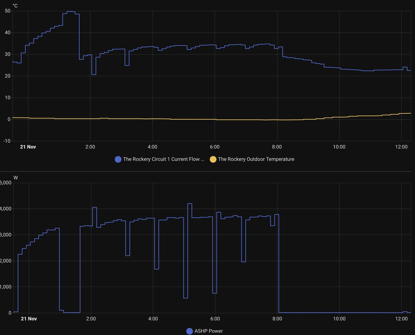 Overnight 42c target. the first curve is my hot water tank run which shows the system is capable of high flow temp.