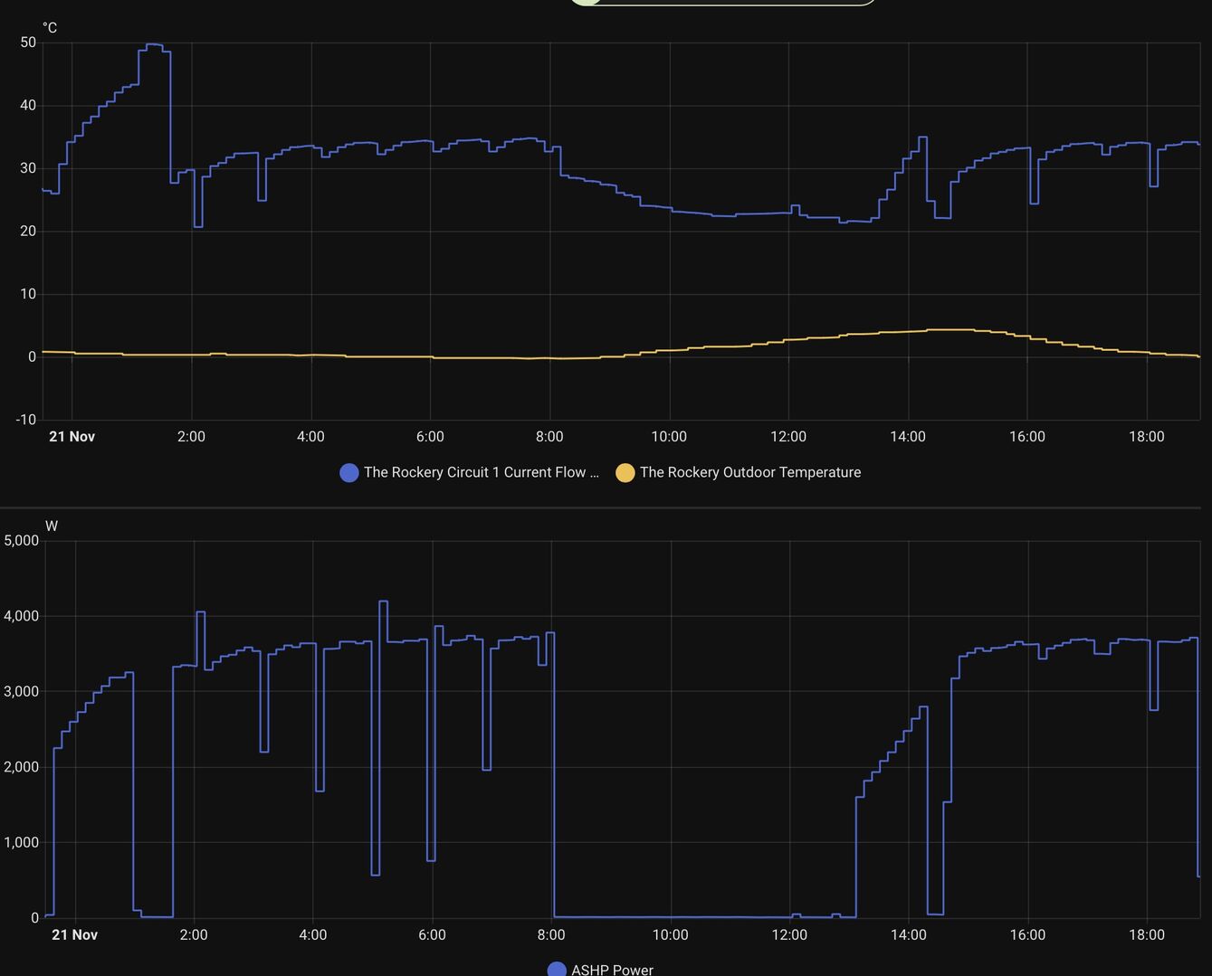 Another thought: can you plot the set flow temp against the actual flow temp? That would distinguish between a controller problem (not setting the right flow temp) and a delivery problem (right set temp, but heat pump fails to deliver it).