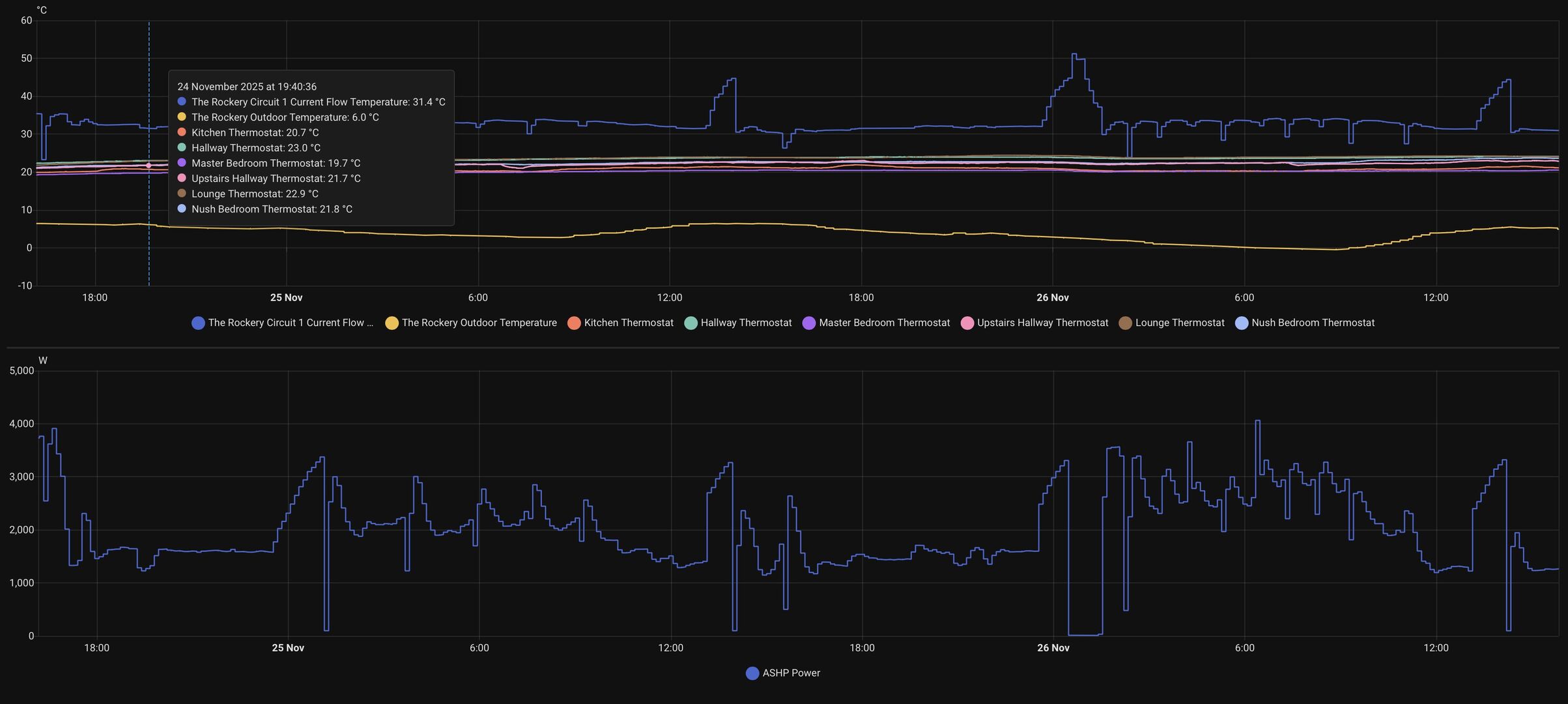 UPDATE: Very happy wife, since 24*7 I've actually had to move the heat curve down to 0.4 as you can see from the charts the temps are staying pretty stable, even overnight drop to 0/-1 no issues at all, will keep running but honestly I think I may still be able to drop (surprising)