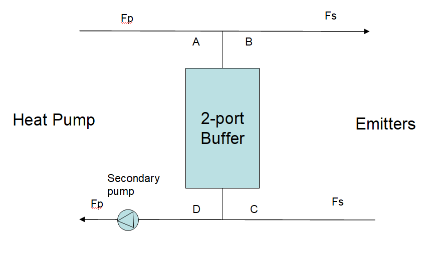 - If Fp >Fs then some of the flow is diverted through the buffer. This will increase Td relative to Tc, because some of the return water is diluted by the flow. Ta will equal Tb so the flow temperature to the emitters will not be reduced relative to case (a) but, because there is a lower rate of flow in the secondary, DT across the emitters will be increased. This will reduce the average surface temperature of the emitters which will in turn reduce their output leading to a requirement to increase flow temperature relative to case 1, reducing efficiency by roughly 1.5% for each degree that DT (=Ta-Tc) rises above the nominal 5C for which most heat pump systems are designed.