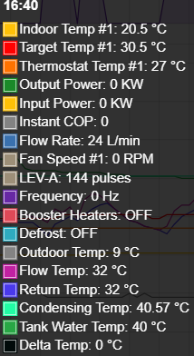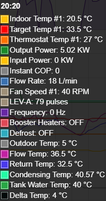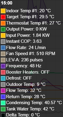 Hopefully the screenshot from yesterday clarifies what I'm referring to. There are two blue bars near the top, which are defrost cycles. Near the bottom of the screen there are coloured bars for the operating mode which includes a single yellow block that was an antifreeze cycle running just after a water reheat (the only time this kicked in yesterday). Just underneath this, there's the operation mode for Zone 1 (the only heating zone I have) where, as far as heating goes, the system was idle during the DHW reheat and the brief anti-freeze mode.
