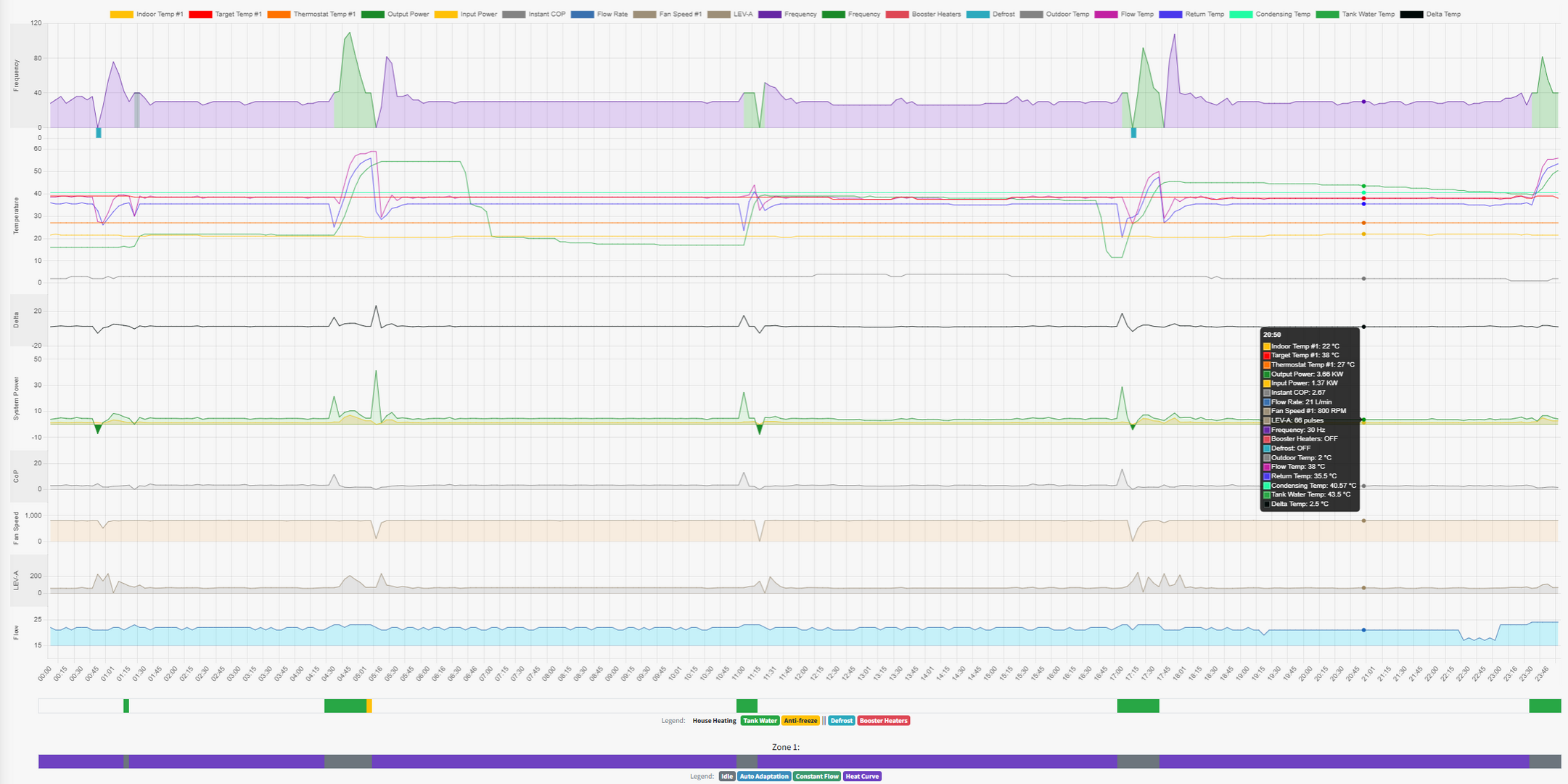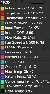 3rd December data is a good example of this. Ironically it's day with a bit of everything in it, including a legionella cycle, a defrost and was also the day when I installed the dongle device to the heat pump to get additional stats from it, which is why the data fields increase from the early evening. The main point to note is the significant amount of yellow in the Zone 1 bar at the bottom, which is when the antifreeze mode is running.