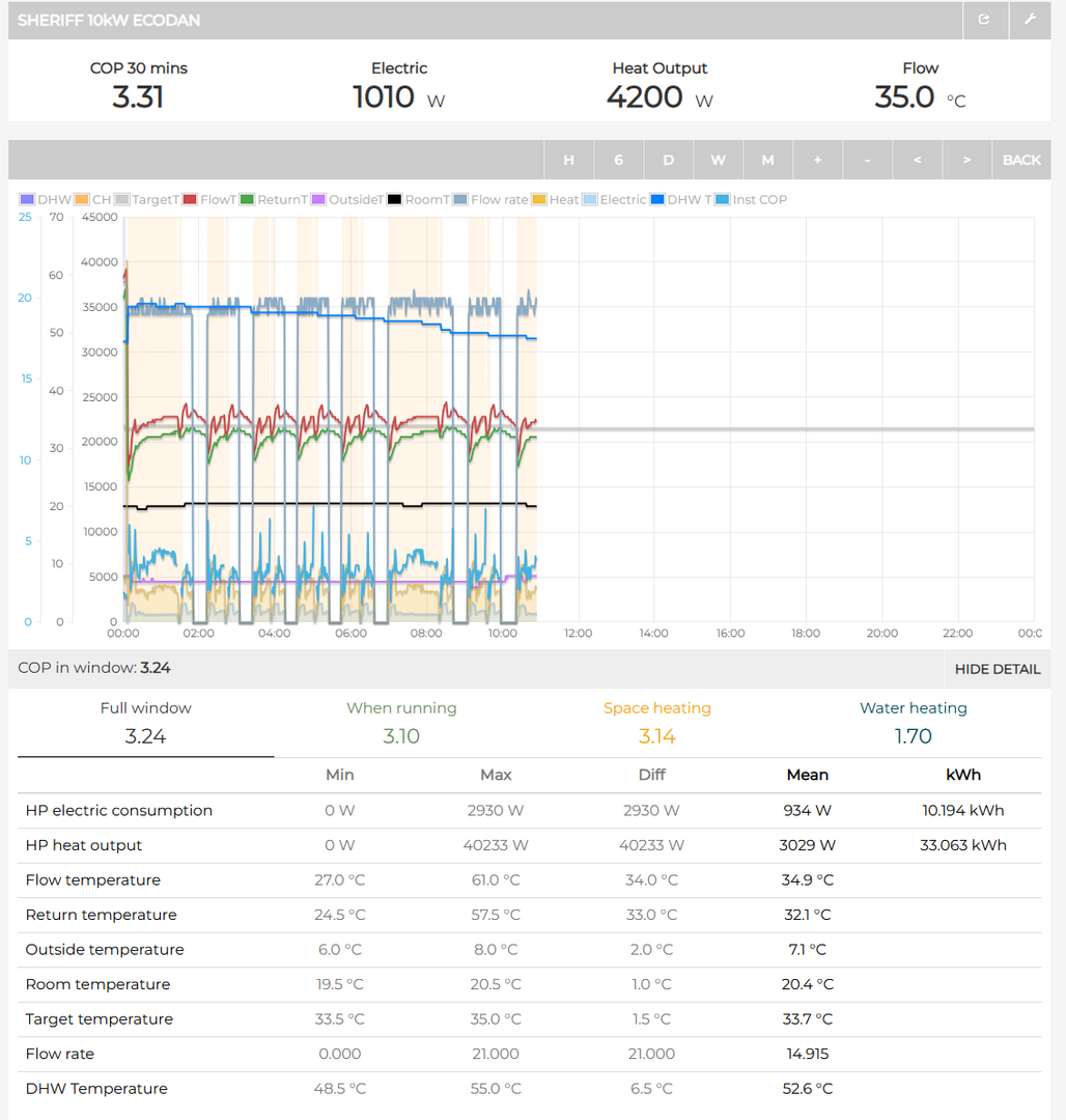 The following day was the start of a milder spell of weather, and the profile for that day looked very different. Heating COP for that day jumped to 3.26 at an OAT of 8.4°C. Since installation the SCOP between late June has been around 3.0, so the system COP figures are low in general, but the system is producing significant savings vs gas heating, so this is a 'niggle' that I'm investigating rather than a concern about a poor installation. The constraints of the house might ultimately be a reason why the SCOP will only ever be modest. As you can see, on this day there's still some cycling happening around the tolerances set around the flow temperature, but it's 'more normal' cycling at intervals of 1 hour or more, with the odd point of interference from DHW cycles (2 teenage girls showering for long periods being the driver as to why these are timed at various points in the day).