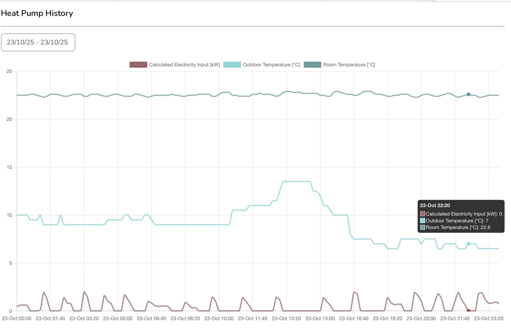 @andrewj In case the comparison is worth anything, here is a chart showing the Homely controlled 8 kW Daikin EDLA08 monobloc for the day of 23rd. October. The values are for IAT (set to 22.5 degrees C 24/7) OAT and power used. More details of my home and insulation etc. in my profile if you wish to read it. The COP was reported as being 4.2 over this period. Regards, Toodles.