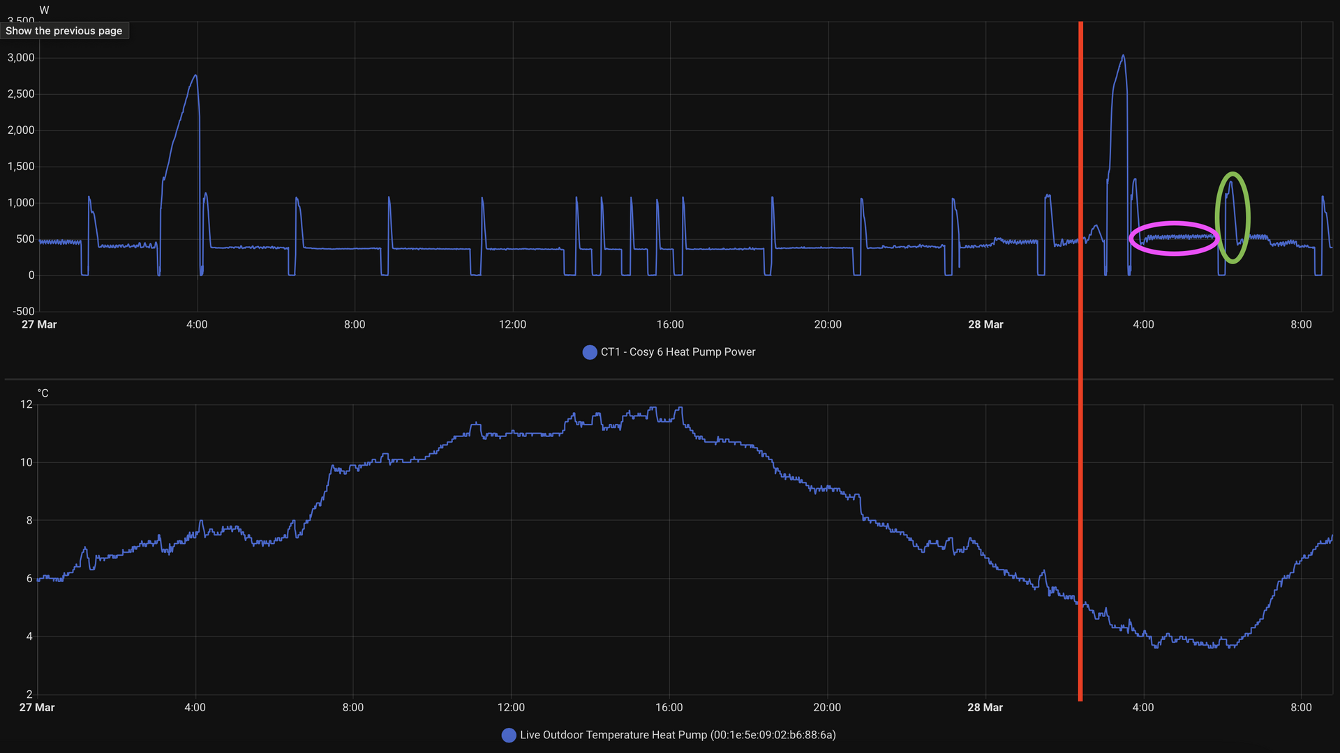 The new behavior seems to kick in after 5 degrees. You can see below where the red line is when the outdoor temp is below 5. The peak just after is the hot water. The green circle is a new behavior as well where it seems to boost to get the flow temp up after a restart. The pink is also new, normally it would be fluctuating like crazy here but it is now pretty stable.