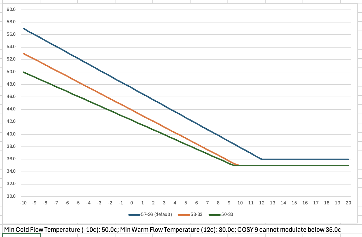 It is 7.5c outside right now so more impacted I suspect by the high OAT end of the curve which I turned down to 33c, from 36c, at around 21:30 yesterday. Cosy 9 isn't running at the moment (fan is stopped) so I guess it's hit its lowest flow temp (35c) and can't go lower?? Could be I need to turn this end up from 33c.
