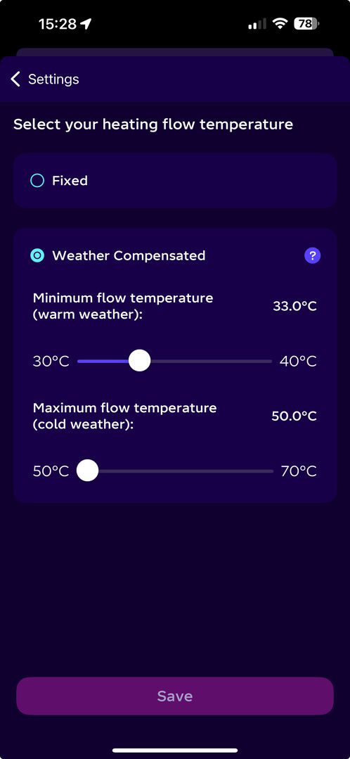 Octopus give very little info on their apps so I know neither the flow rate nor if there's a way to impact the minimum and maximum cold/warm weather values: 50c-70c and 30c-40c respectively. Defaults are 57c and 37c. If there is an installer setting I'd have to go through Octopus to get it changed. I don't have UFH and I suspect they would install a Daikin unit for those scenarios, but just to be clear that we are talking the same thing, I've posted the Flow Temp adjustment screen in the app.