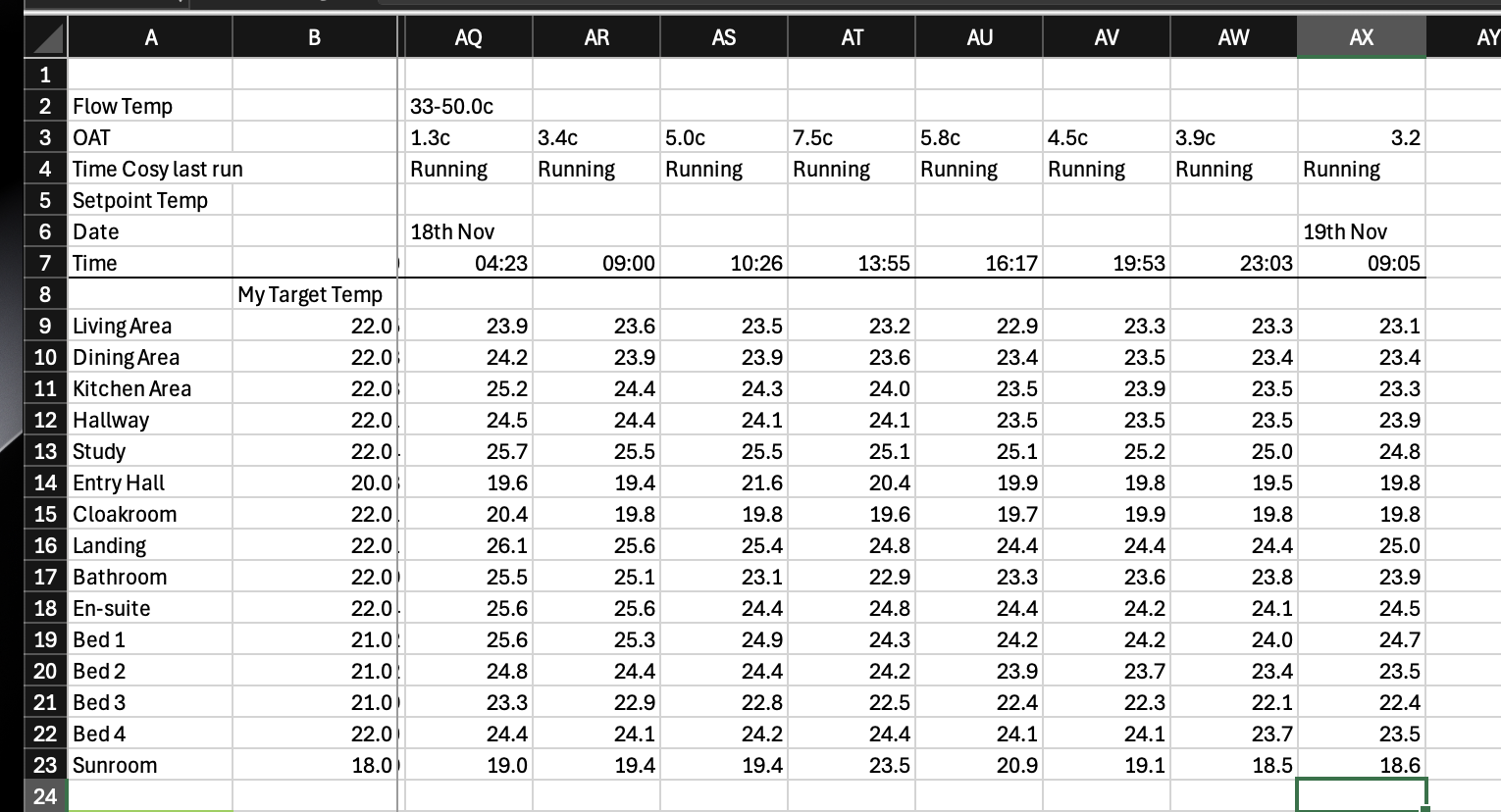 Having not made any adjustments since 4am yesterday, this is the state of play this morning (attached pic.) Just us getting up and on with the day has raised temps a bit since 8am, 0.2c-0.3c in some rooms. However, upstairs has cooled down a bit. The Bed1 and en-suite are a bit misleading because of course they have been used by two people (IIRC, these were around 24.2c at 7:30ish.) OAT was down to 1.6 at 7am.