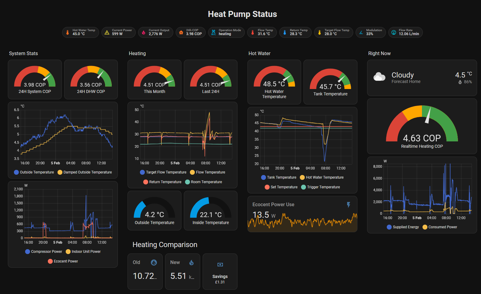 It remains to be seen how well this works across different parts of the performance curve, but for now we're comfortably around a COP of 4.5 while the outdoor temperature has been around 5.5C.