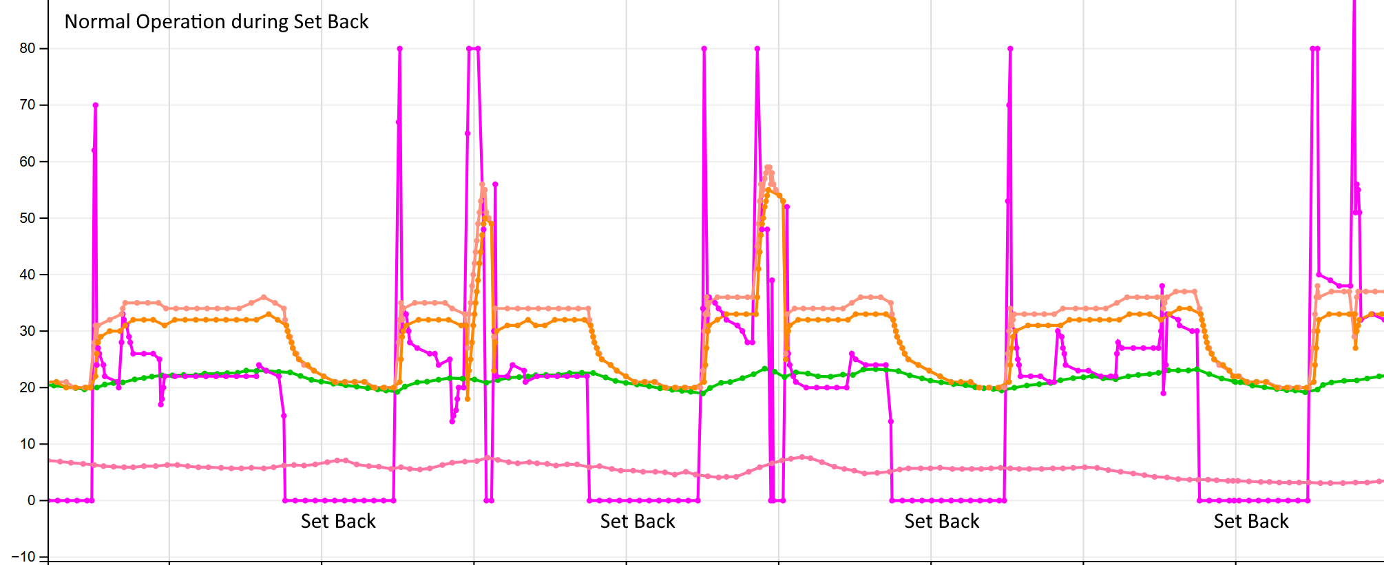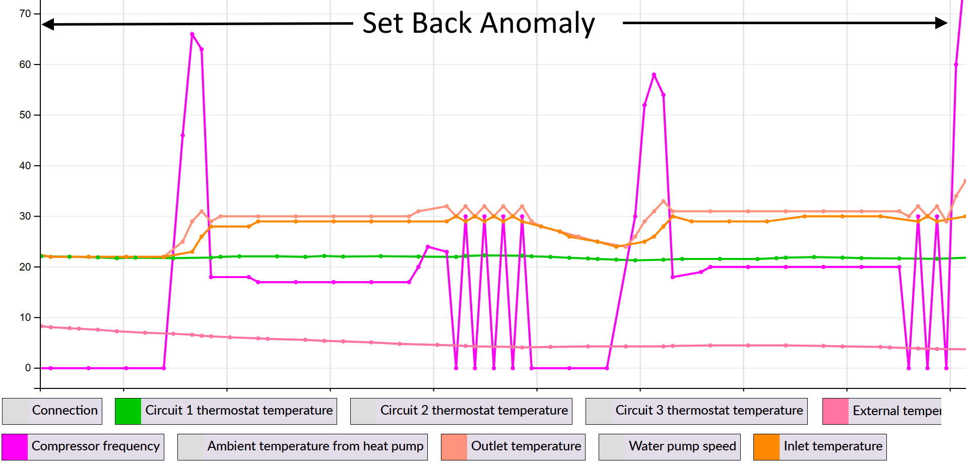If you look at the two graphs, one shows normal operation during ‘Set Back’ where the compressor remains off. The second graph shows the compressor coming on randomly. The internal and flow temp was around 22 degrees, and the outside temp is between 5 and 7 degrees, so the compressor should not have come on.