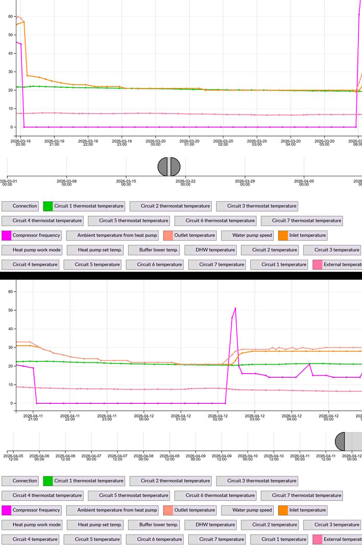 Posted by: @unsureI’m using WC with a Stat attached. This is the standard setup with the Smart Controller. The manual points to a relationship between the Air and Flow temperature controlled by the WC. (The air temp relates to the decreasing water temp, see page 33 in the Smart Controller manual 2024). Even taking all that into account, when the conditions are the same, the HP should behave the same. E.G. what changed to activate the heat pump between 1pm-2pm on the bottom graph.