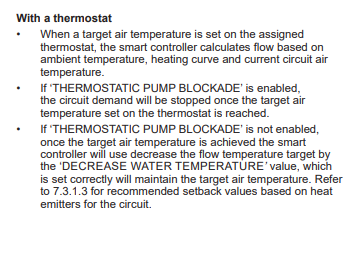 I have the Grant Volumiser. There are no secondary controls, just the Smart Controller (EcoNET). Each time I approach Grant about this issue, I’m told the compressor reacts to the flow temp when pump blockade is off not the room stat. So, there must be a relationship between the Set Back and Flow temperature (Room Temp and Water Temp) otherwise what is the point of adjusting the Set Back via the room stat?
