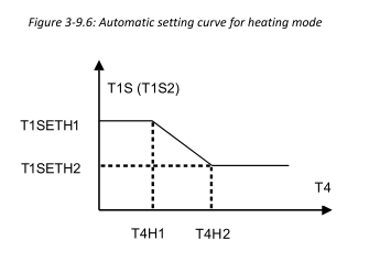 T1SETH1 and T1SETH2 are the LWT (flow) temps we set, T4H1 and T4H2 the OAT. Either side of the slope, which sits between the end points we set, the 'curve' flat lines. If the OAT goes below T4H1, the LWT doesn't get any hotter. By moving T4H1 a bit lower, the LWT continues to rise to that lower point, and only then flat lines. I have at times set my T4H1 to -4, but it is currently -2°C.
