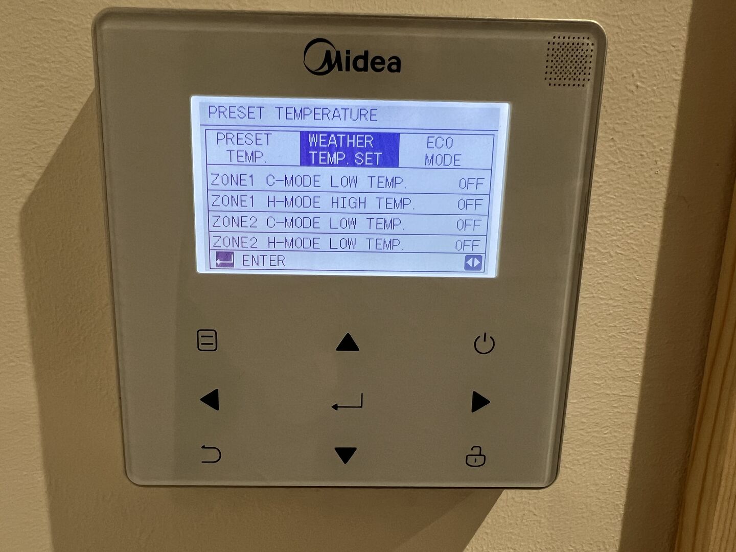 You are correct, the display in your photo shows weather compensation is off. You are looking in the right place, the WEATHER TEMP. SET (Midea-Speak for weather compensation) tab is where you turn it on. You need to set the second row, ZONE 1 H-MODE HIGH TEMP. to ON. You will then get to chose the curve, select '9' which is the custom curve, ie the one for which we set the parameters.