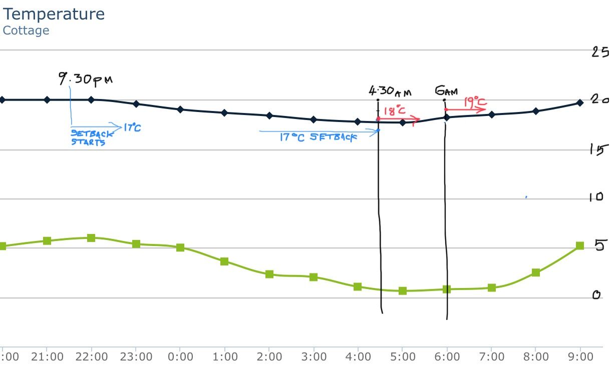 the attached graph shows the times our schedule changes and the degree of setback. The room temperature line is the black line and in this illustration the room temperature doesn’t drop to 17C. But the temperature is below 18C at 4.30am so the HP will,start to heat at 4.30am.