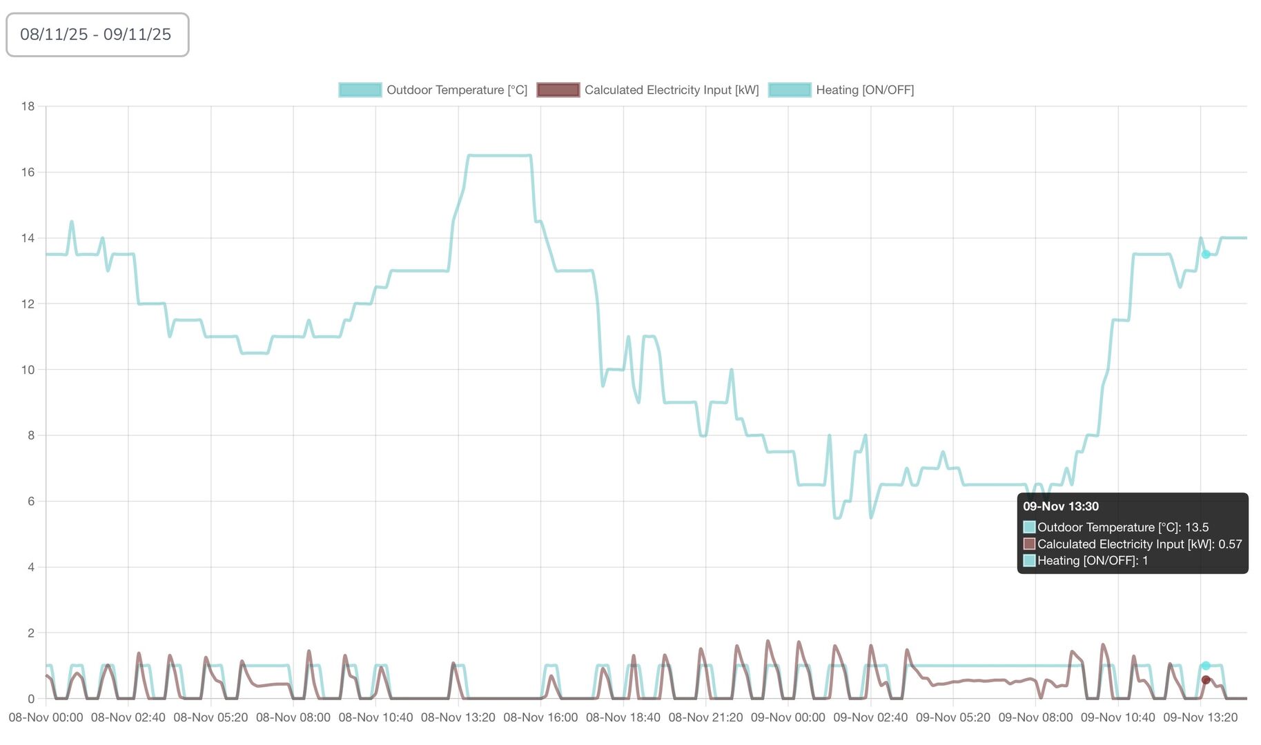 @ubert767 Just for comparison, here is a plot of my Daikin EDL08 Monobloc system from the last 36 hours or so; the pump is controlled via a Homely smart controller and we heat the whole house to 22.5 deg. C 24/7. You will see that when the OAT drops to ~7 deg. C, the system just ticks over at ~400 - 500 Watts without any cycling. Regards, Toodles.