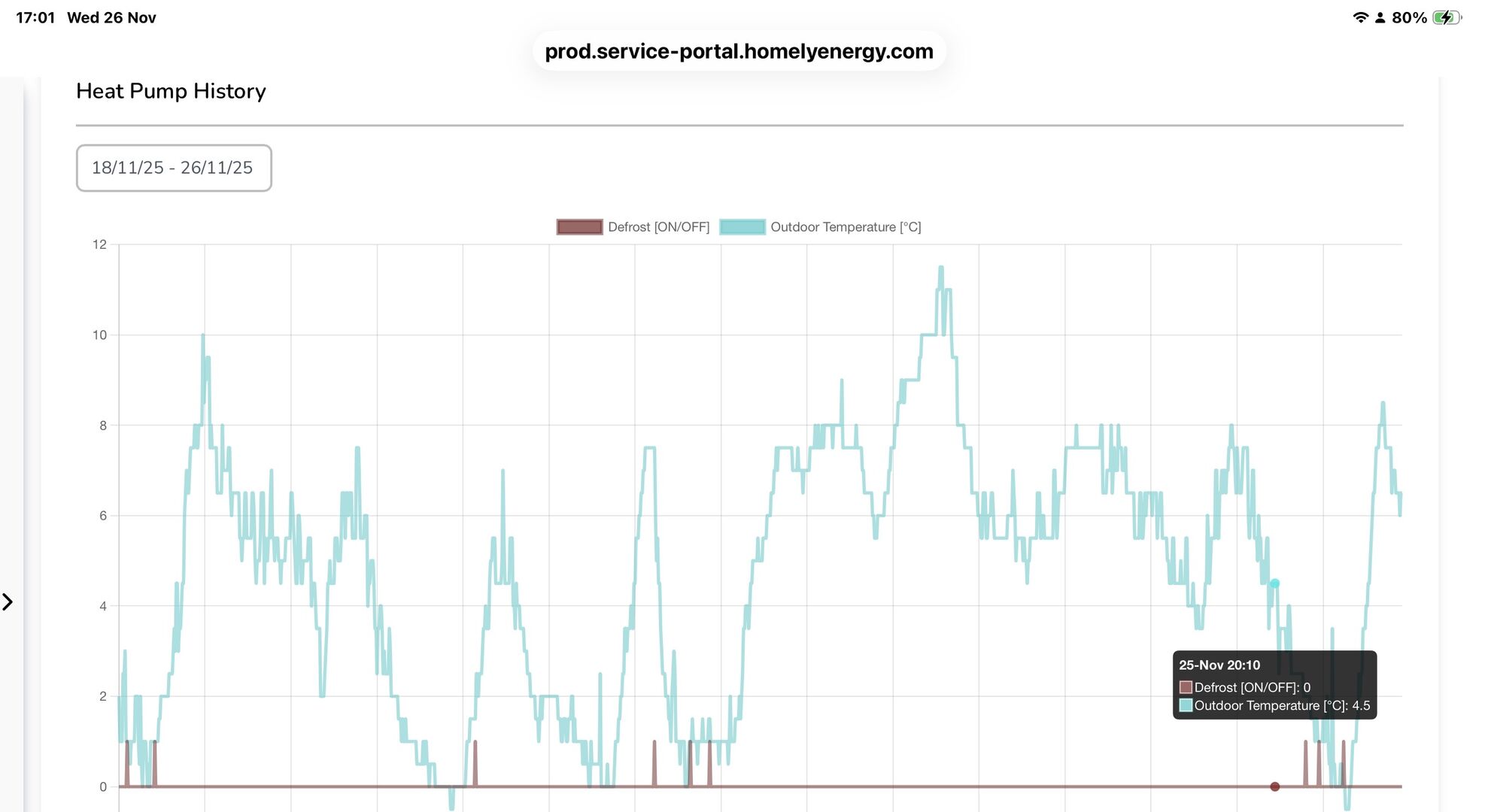 @jamespa I decided to look at my Homely data for defrosts and the first of this season was on the 18th. November (I have only noticed 1 of them myself) but the Daikin EDLA03 8 kW Monobloc has actually had 9 since the 18th. The plot shows outside temperature at the times they occurred.