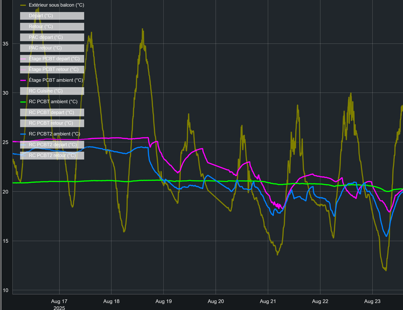 In winter, the enormous south facing windows let in a considerable amount of heat when the sun shines, but... due to the thermal mass, it only raises the indoors temperature by 1°C at the end of the day, all the heat is stored. In summer, the shutters are extremely effective against solar gain. Indoor and outdoor temperatures during the last summer heat wave, while the house was empty: