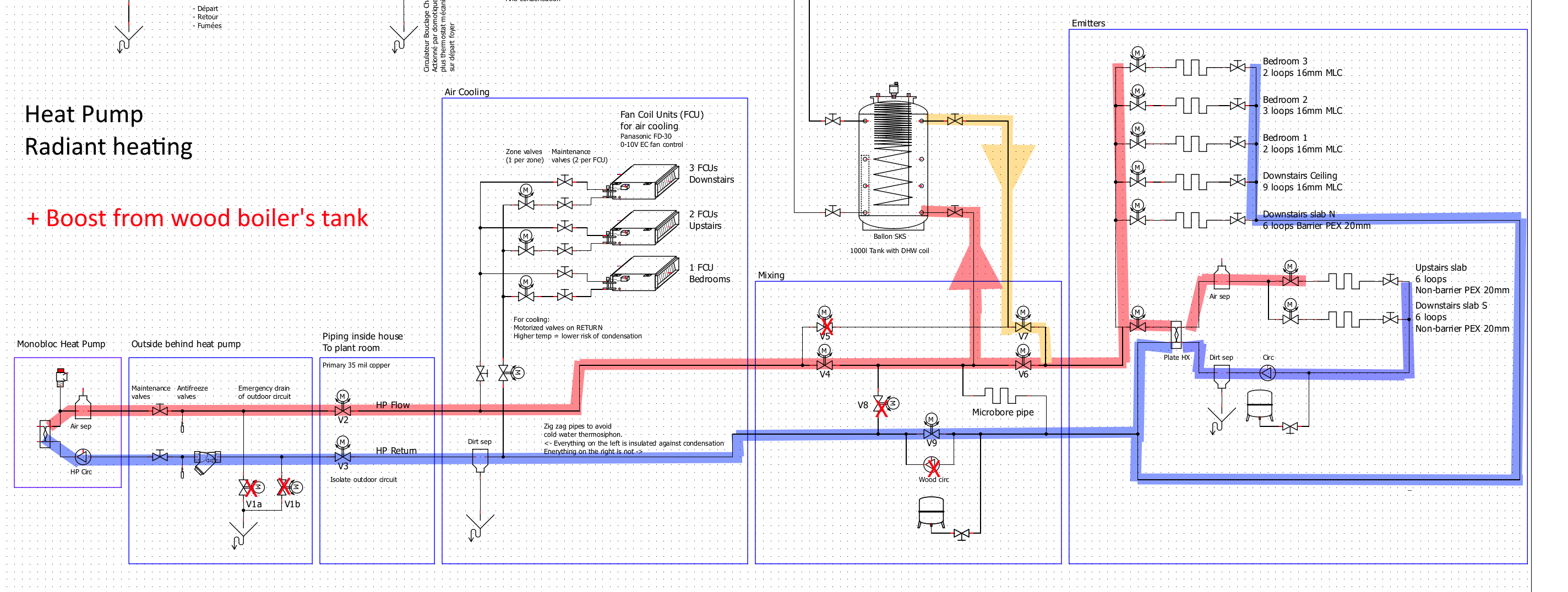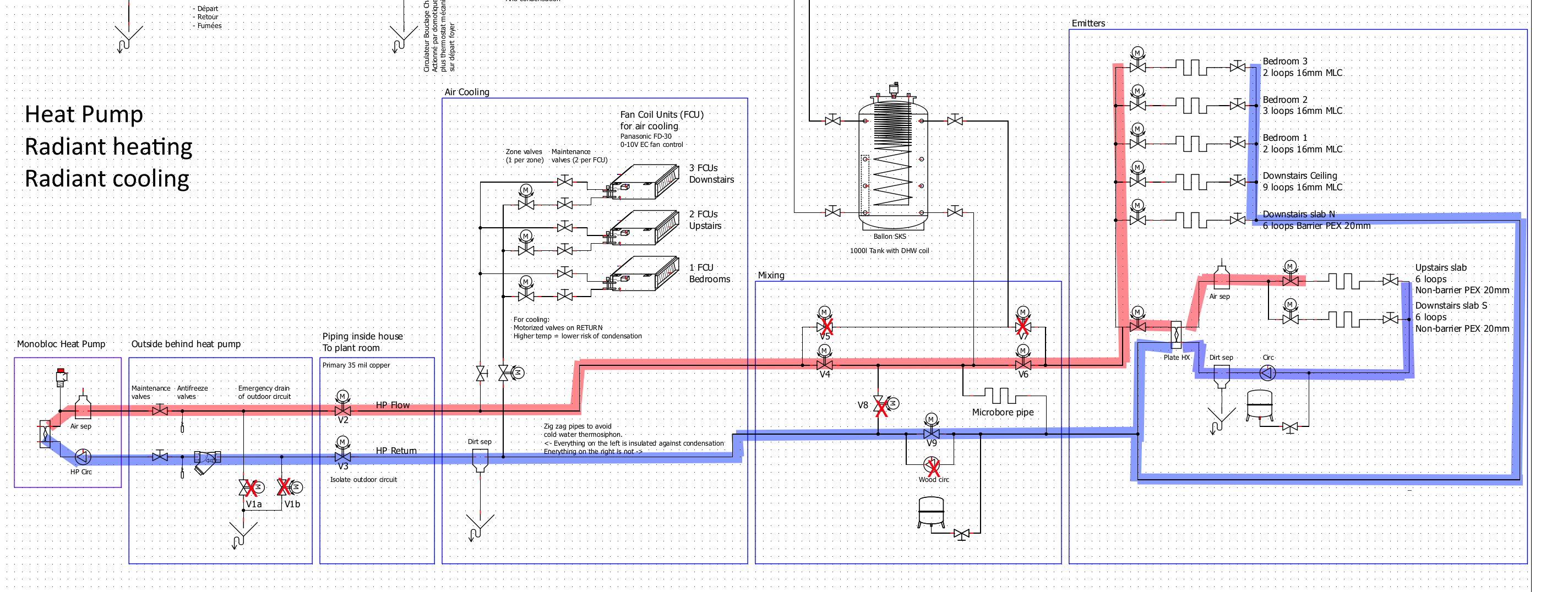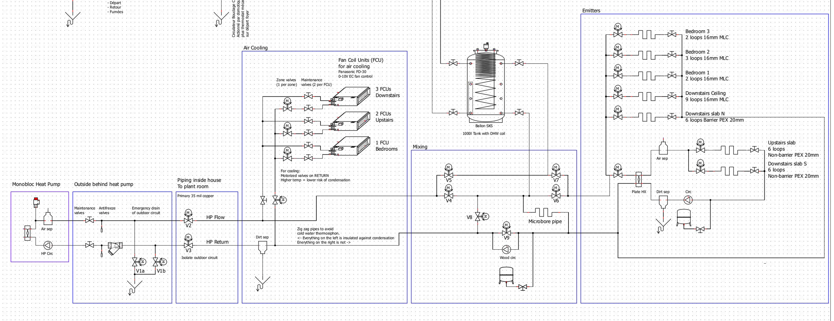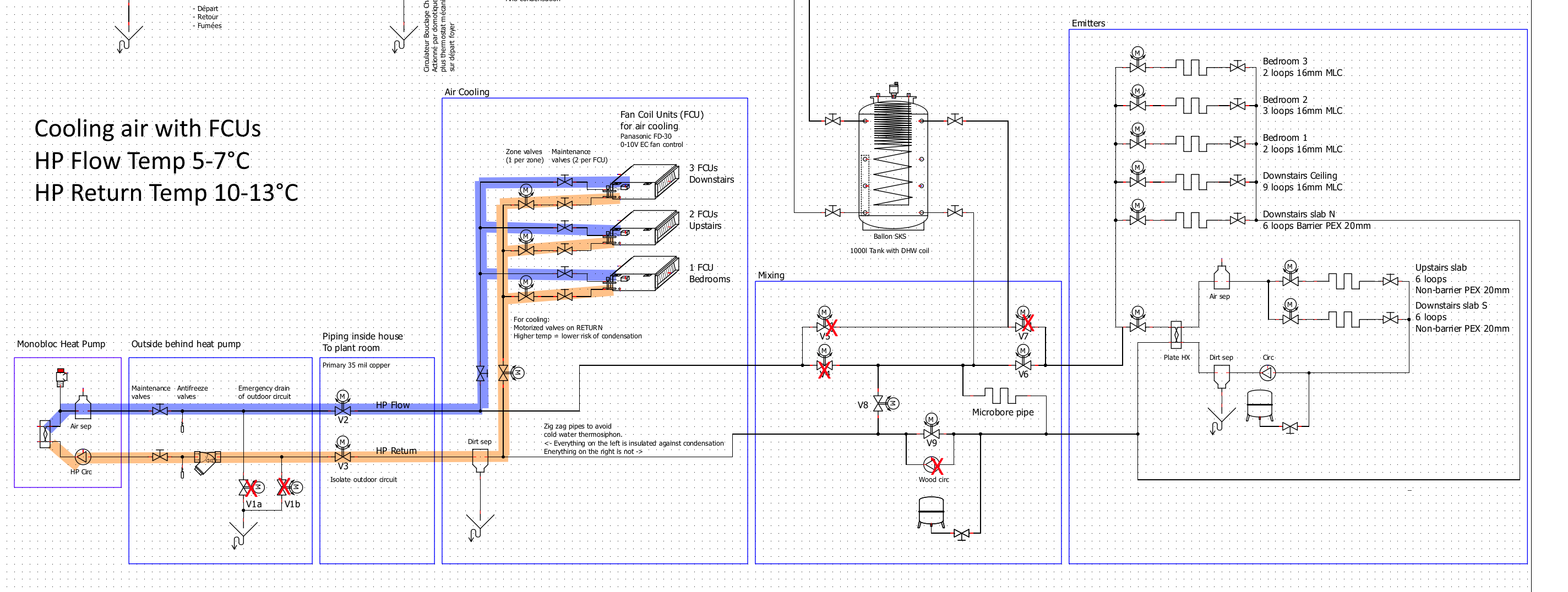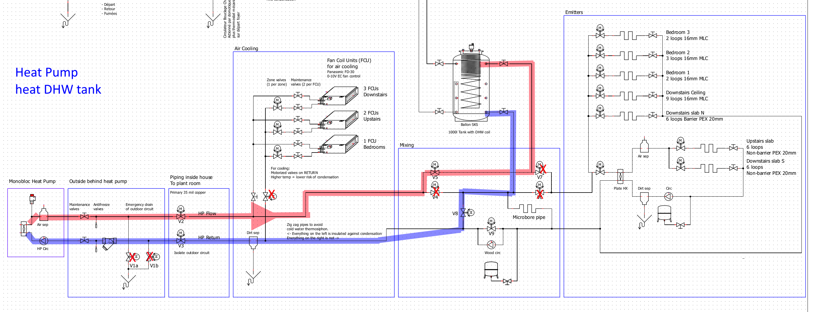 In summer, cooling to a civilized temperature is an absolute requirement, so my pile of Panasonic fan coil units goes in. With 5°C water, all pipes must be vapor tight insulated which is a pain. So when cooling, cold water must flow ONLY to the fan coils, with the rest of the circuit remaining at ambient temperature thus not requiring careful insulation. Fan coils pressure drop and flow are within heat pump requirements.