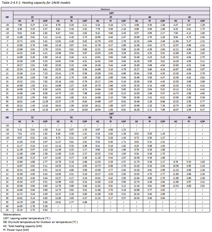 Here is the capacity table. Around 9kW heating capacity at -10C i think should be enough.