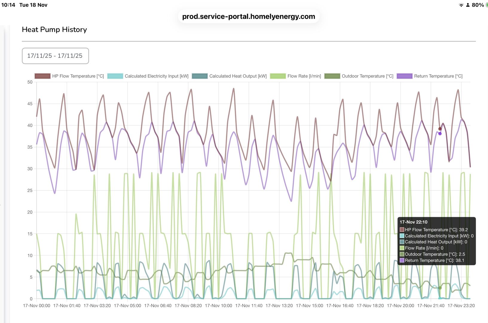 @steelbadger Attached is the plot for various parameters for our Daikin for yesterday Monday 17th. November; we had temps down to 4 degrees C. and I still see some cycling going on but you will observe the powerful starts. I had expected to see more ‘low and slow’ running than this, rather than bursts of high flow running and then turning off for intervals. With my sight, I can never be sure I am quite seeing what I think the plots are showing me though! Regards, Toodles.