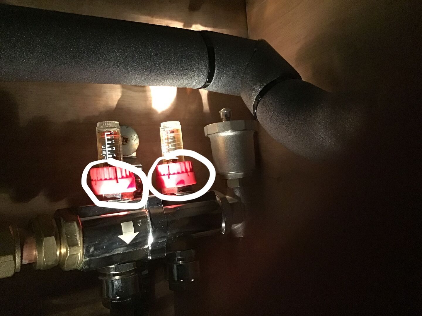 i am slowly getting to know my system, installed Sept. last year. During a call to Vaillant today, the tech support indicated that something odd appears to be happening in that the flow and return DT is mostly <5C. My hand on the UFH flow and return suggest the flow is as expected but the return is ambient - cold to touch. The circuit has its own pump, which has a green light so seems to be running. The pic below shows the flow meters - with which I am unfamiliar. My first impression was that the flow is actually zero - which would explain the cold return. Have I interpreted the picture correctly?? Apologies for the poor lighting and hope it is enough. Both meters have the red disk in the same upper position. Any advice would be appreciated.