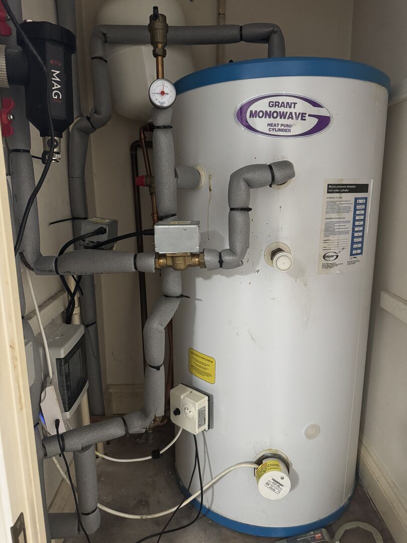 So back story…. 5 yeas ago I decided to “go electric” and installed solar, battery, Eddi and a Zappi for my EV. I then decided I’d like to get off gas and took advantage of the green homes grant and found a local installer (now ceased trading) who installed a heat pump taking advantage of the then £5k grant and installed the system including a new DHW cylinder. At the time the grant could only make up 2/3 of the total cost and so he manged to come in at £7.5k so my grant was the maximum and cost was the minimum at £2.5k. However, this meant no upgrades to rads or pipework and an oversized heatpump. The house is a 1994 3 bed semi of about 90 sq metres with 22mm simple copper backbone running front to back with 10mm copper flow and return tails. The downstairs rads obviously have longer tails running in the cavity. The heat loss survey conducted at the time gave a figure of 3.2kWh which is all I have to go on and I assume it’s based on sound data?? As part of the installation they removed my old gravity system water in the loft but brought the 22mm plastic flow and return pipes up the outside not the house into the loft and through a large what I assume is a volumiser tank (don’t know how big this is) and then down into the old airing cupboard where the new 200l cylinder is located. I don’t believe there are any pumps. In terms of the heat pump the initial design specified a 6kW Grant Aerona3 but at the last minute he offered me an “upgrade” to a 10.5kW condenser - and being ill informed and stupid I thought “bigger must be better” and accepted.