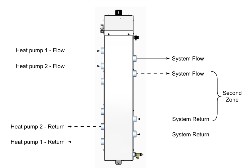 - by using 2 feeds out of the LLH you could have separate secondary circulation pumps for each zone, set to a flow rate appropriate to the energy demand of the zone. You'd still have mixing issues across the LLH, but at least you'd be exploiting what the LLH provides, rather than having to work around it. Of course, this example is only mentioned in the LLH guide, and not shown at all in the HP Installation guide itself, and I think @crimson doesn't have a Grant LLH, so that's not an option in their case.
