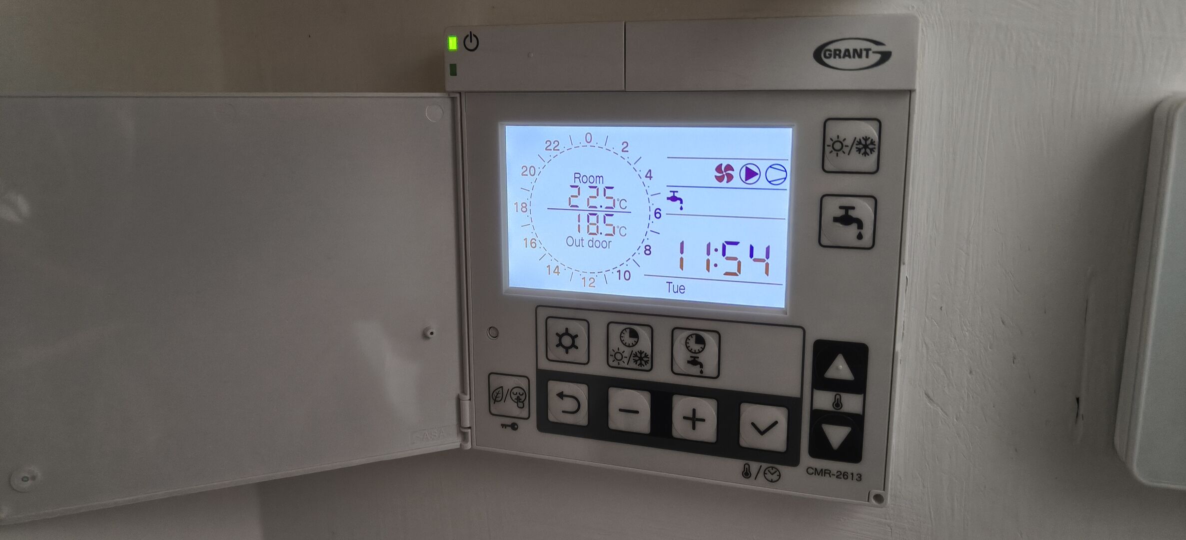 Grant Aerona 290 15.5kW, Grant Smart Controller, 2 x 200l cylinders, hot water plate heat exchanger, Single zone open loop system with TRVs for bedrooms & one sunny living room, Weather compensation with set back by room thermostat based load compensation