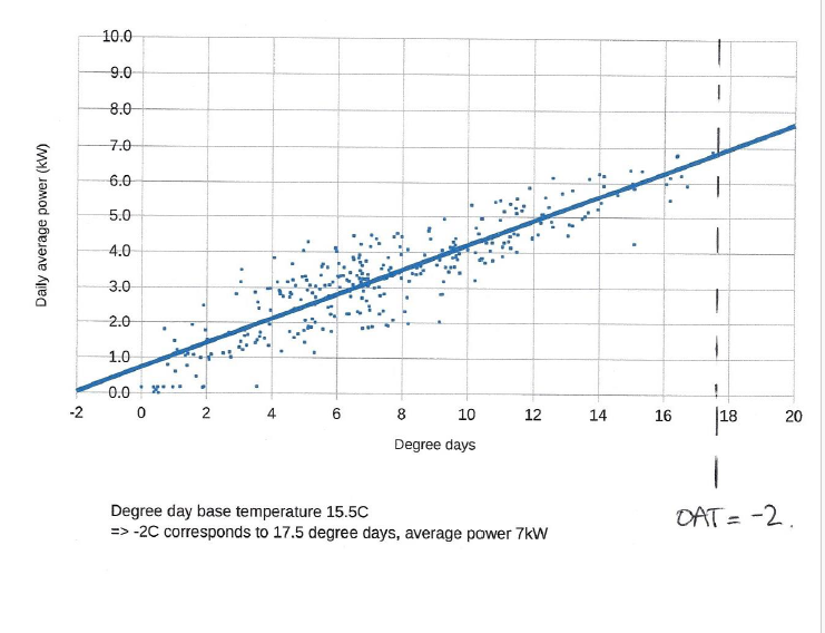 Im doing some work on a friends heat pump installation which I feel is oversized, but until we get some cold weather I cant be sure how much. However it got me to thinking that if I know the total heating energy each day and the average Outside Air Temperature, I could plot a scattergram of hourly heat loss v Mean OAT, add a trend line and extrapolate that down to -3C.