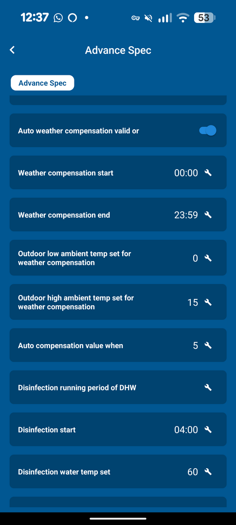 Posted by: @johndWeather compensation is enabled although it doesn't seem to alter the flow temp automatically based outdoor temps. Low is 0 degrees and high is 15 degrees