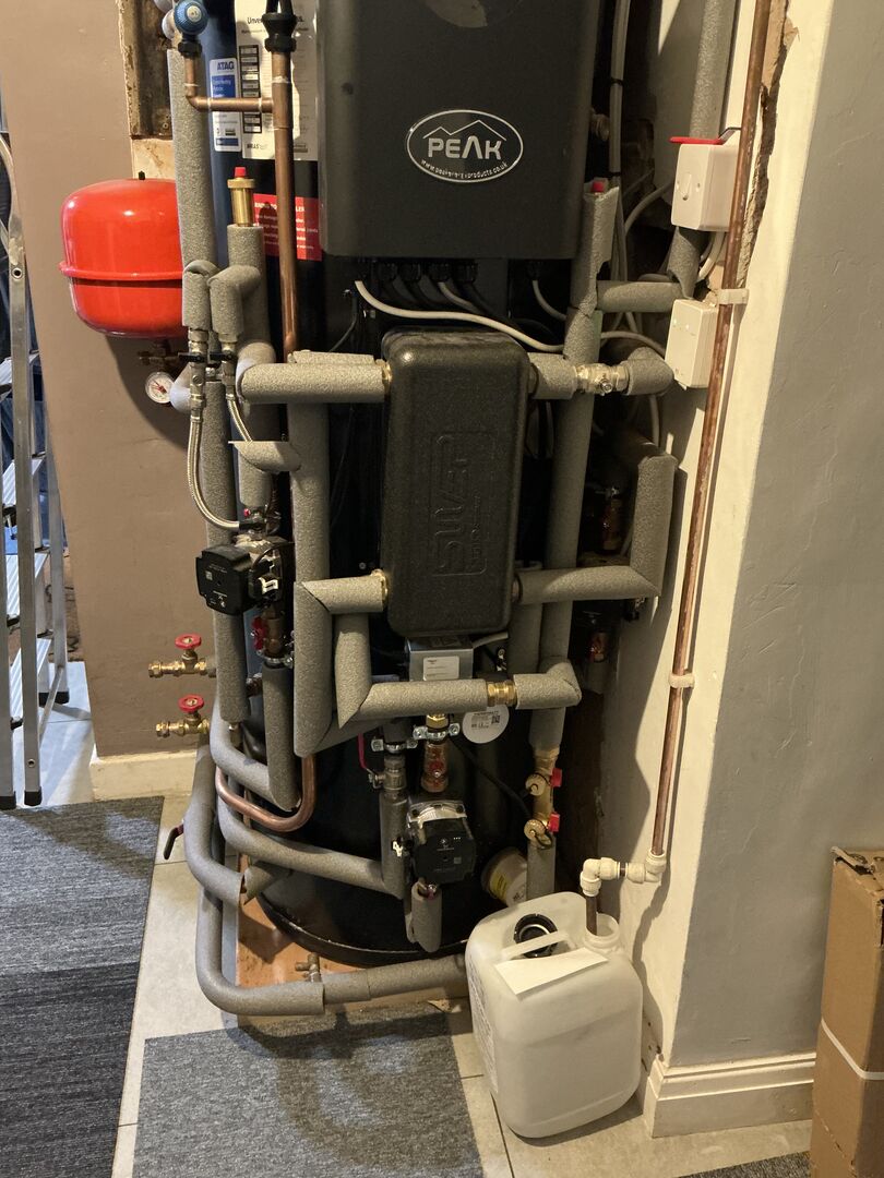 Is that a plate heat exchanger above the bucket. Can you tell whether it is connected to the DHW or to the space heating between heat pump and emitters?