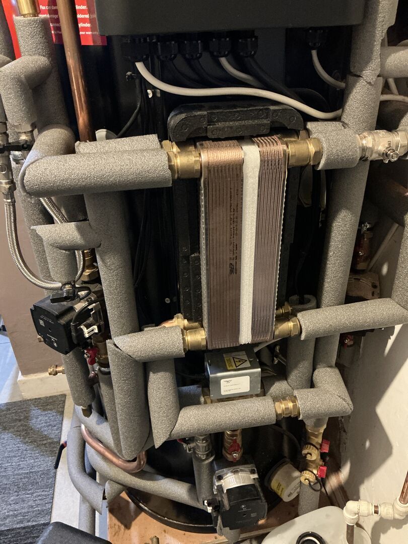 Heat exchanger picture without the polystyrene cover (space heating on the rleft and DHW on the right), pumps also visible on the left, underneath and one slightly hidden on the right;